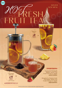 Hot fruit teas with flavors like mango, passionfruit, and citrus